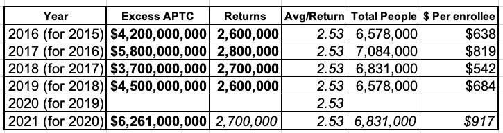 I also found the same report from a few years earlier, which notes the 2016 numbers as 2.6 million returns totalling $4.2 billion in excessive APTC.