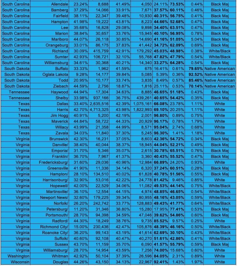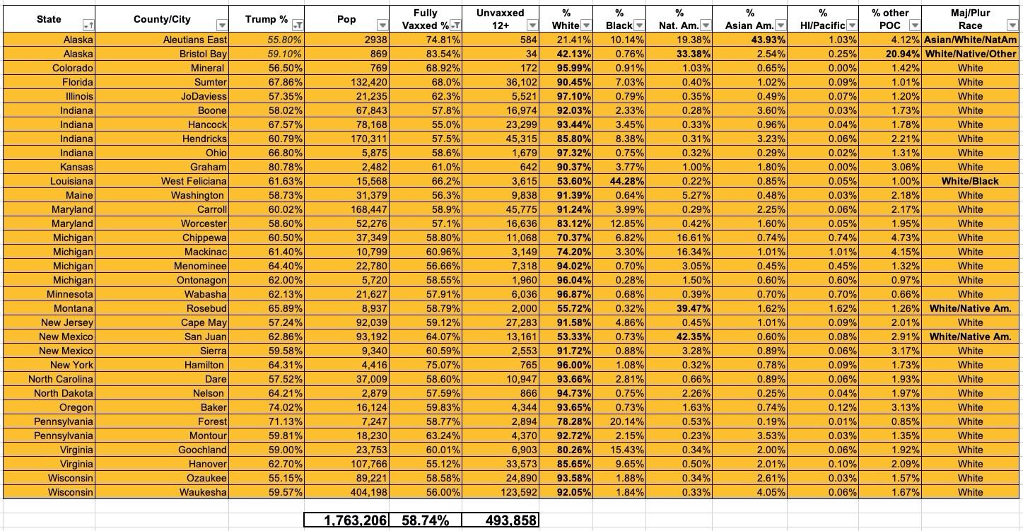 The most obvious thing they have in common, besides high Trump support, of course, is that 28 of the 33 have a solid White majority. The outliers are Rosebud, MT (39% Native American); West Feliciana, LA (44% Black); San Juan, NM (42% Native American); Bristol Bay, AK (mostly split between White, Native American and Other People of Color); and the E. Aleutians (44% Asian American).
