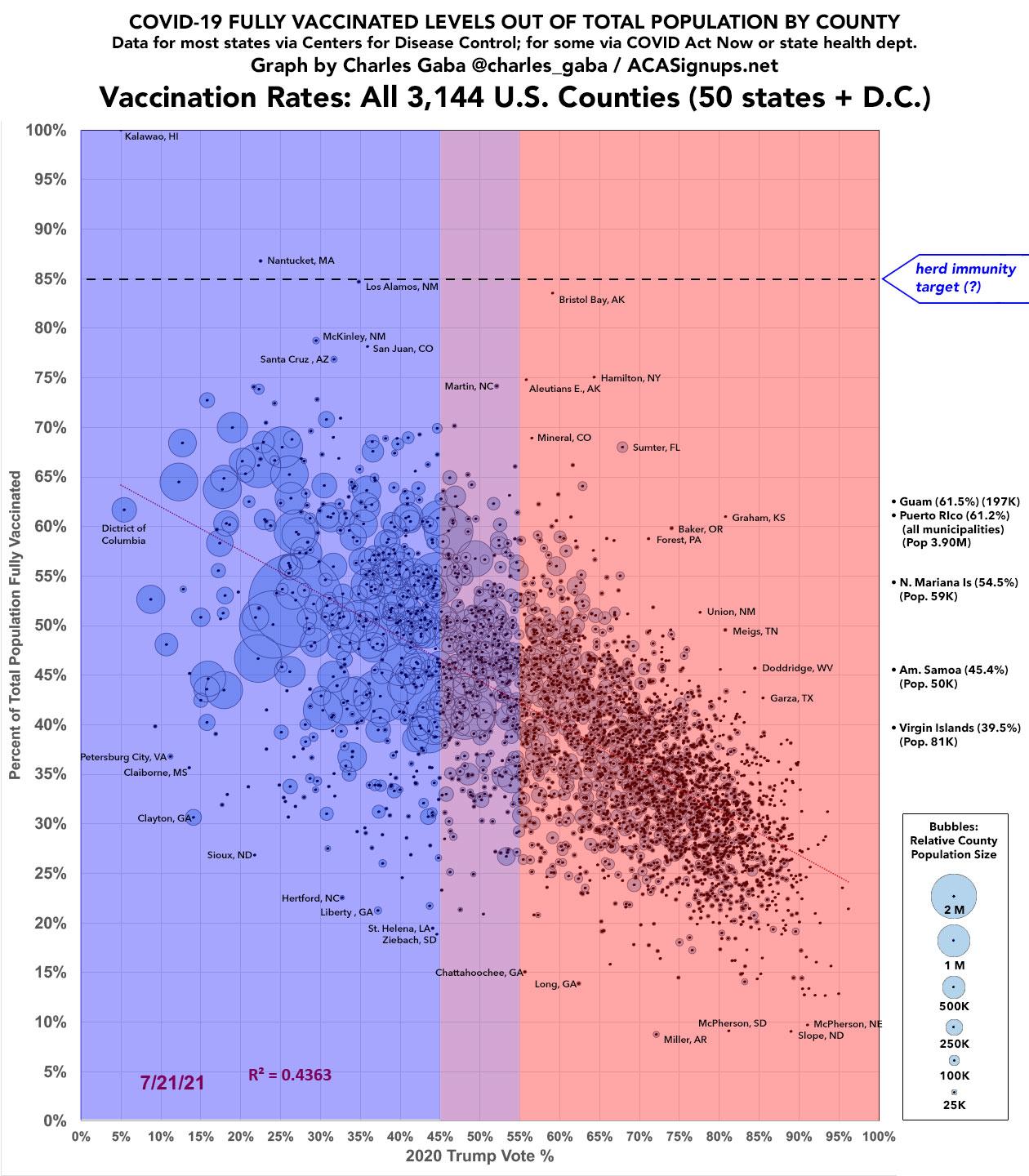 A few weeks ago I posted a look at the county-level COVID-19 vaccination rate outliers...the counties which don't fit the main pattern of heavily-Trump counties having low vaccination rates and heavily-Biden counties having high vaccination rates.