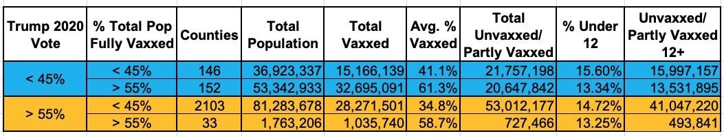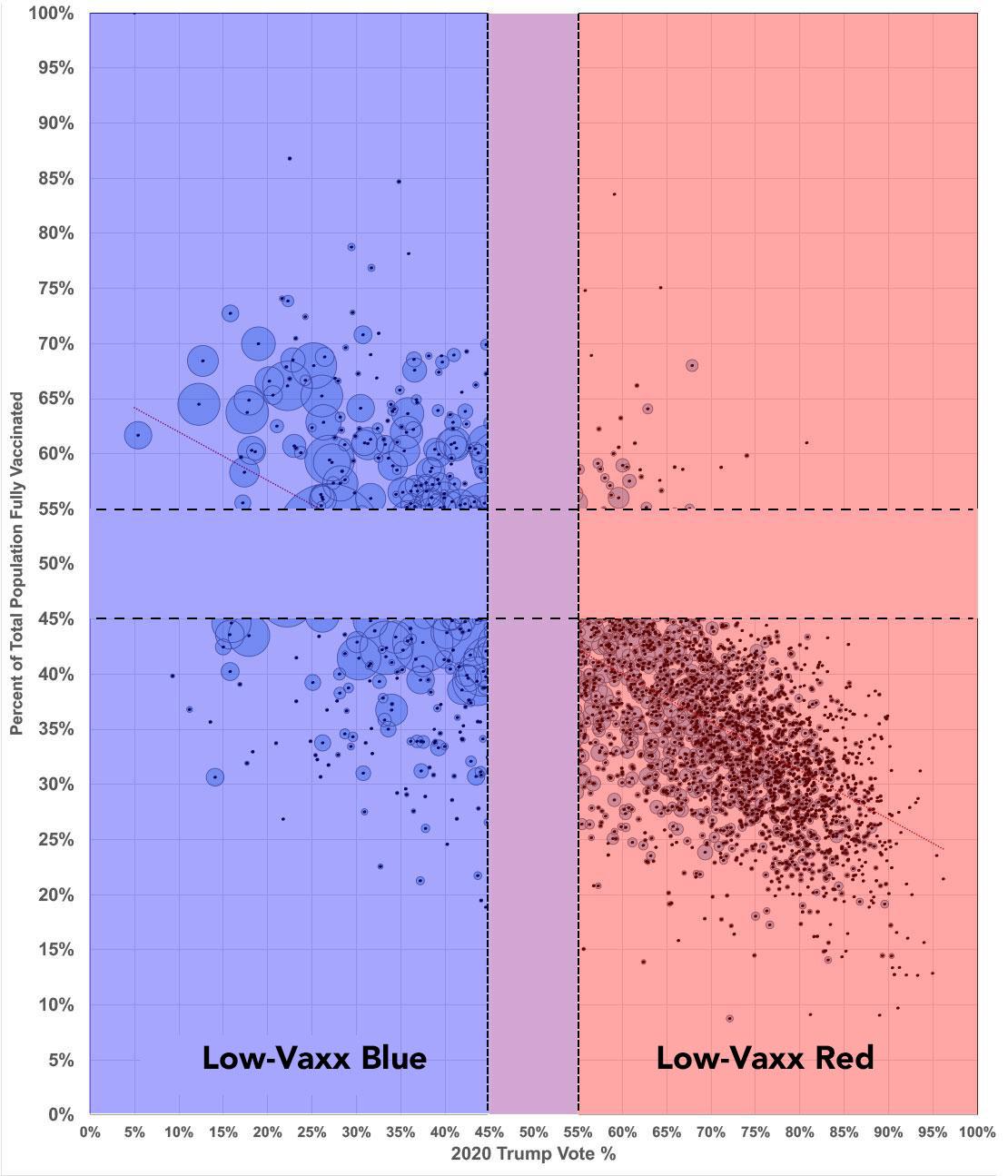- 2,103 counties are "low-vaxx Red"...less than 45% vaccinated, Trump received more than 55% of the vote
