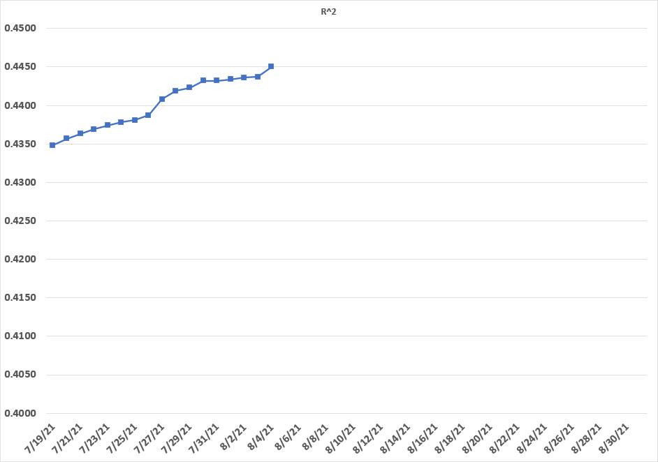 As an aside, this is also interesting...the R2 value has been gradually increasing as time passes. Since none of the county vaccination rates will decrease, this suggests that the lowest-vaxxed counties are catching up to the higher-vaxxed counties, since the range is narrowing: