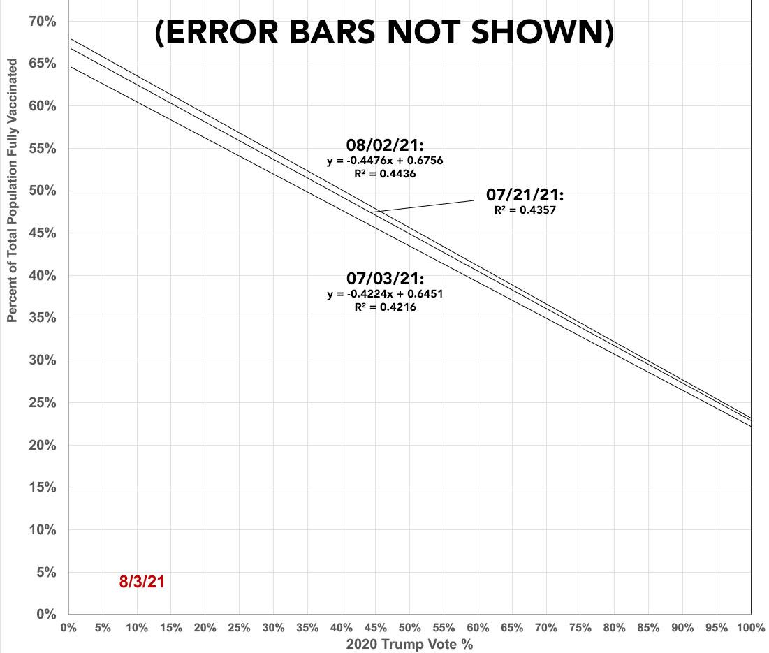 It's possible that this trend will reverse itself once the effects of the Republican Party's recent vaccination messaging turnaround starts to kick in. Since I'm only reporting fully-vaccinated data, any such impact won't start showing up on my graph until around August 11th and beyond, since that will be roughly 3 weeks after the GOP did a 180 and started pushing their base to actually get vaccinated after all (i.e., that's when anyone who ran out and got their first Pfizer shot the week of July 21st will be getting their second one; for Moderna it will take another week beyond that).