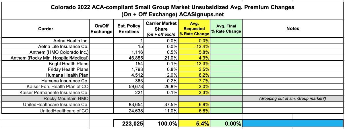 Colorado: Preliminary avg. 2022 #ACA premium rates: +1.3% indy market, +5.4% sm. group market