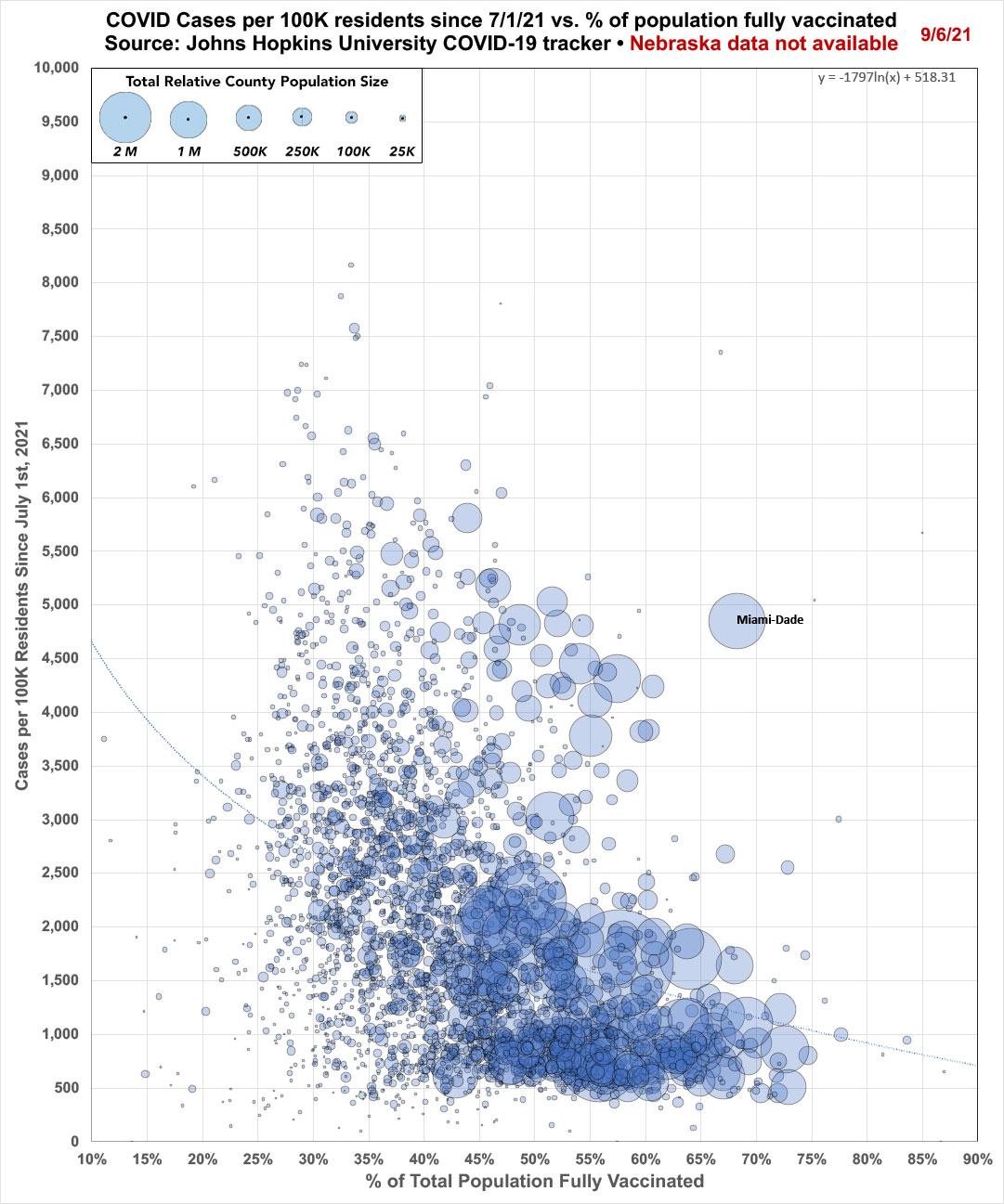 According to the Centers for Disease Control, Miami-Dade has fully vaccinated 68% of their entire population (1.84 million out of 2.72 million residents). I use the slightly lower official 2020 U.S. Census popualtion count for Miami-Dade County (2,701,767), which makes the vaccination rate slightly higher still: 68.24%.