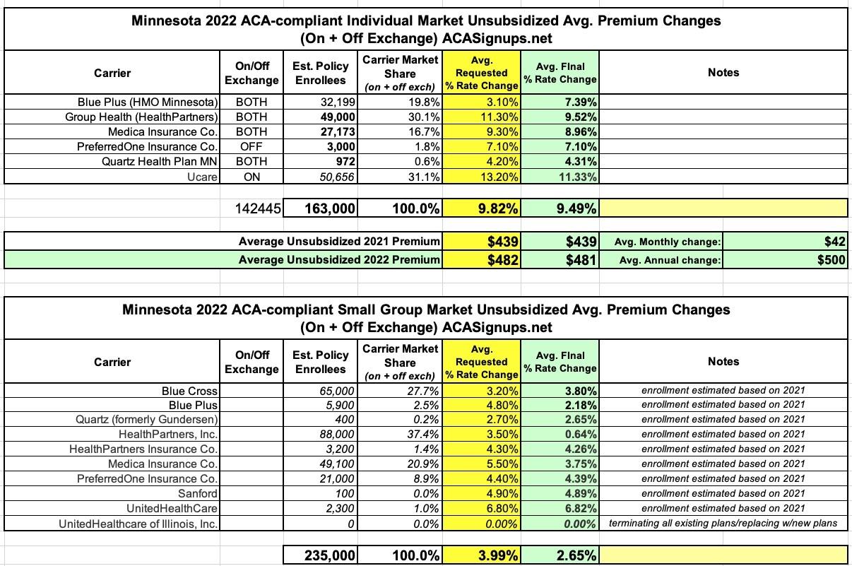 For small group health insurance plans, which serve employers with fewer than 50 full-time employees and cover about 4.1% of Minnesotans (235,000 people), the final average rate changes for 2022 range from 0.6% to 6.8%. For the individual health insurance plans, the final average rate changes for 2022 range from 4.3% to 11.3%.