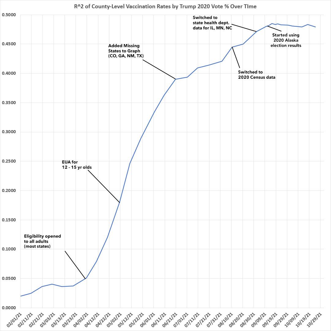 It's also important to note that after both the R2 (correlation) and slope formulas have pretty much plateaued and have even started to drop slightly over the past few weeks. It'll be interesting to see what happens about a month after the FDA gives final approval to the Pfizer vaccine for 5-11 year olds.
