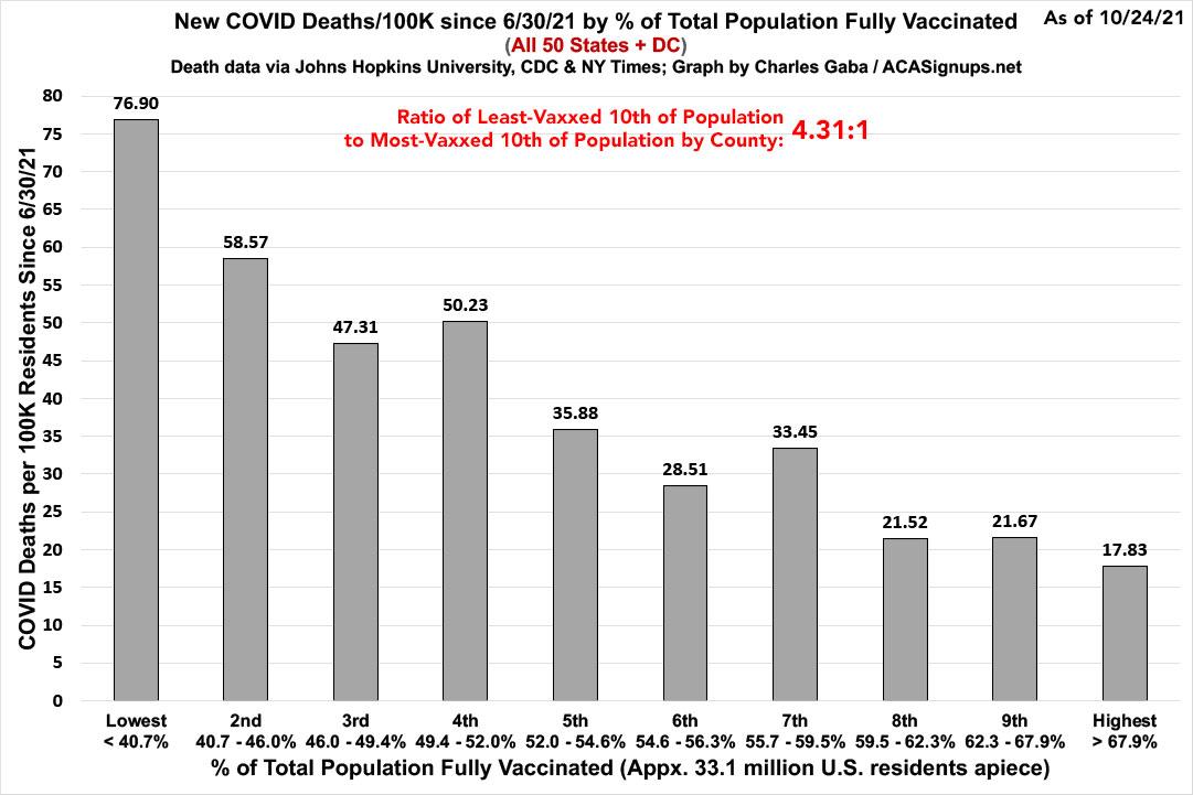 ...while when you look at the death rates, the contrast is even more stark: Death rates in the least-vaxxed tenth are 4.31x higher than in the most-vaxxed tenth:
