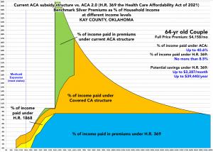 Taking this further yet: If this same couple were 64 years old...the highest age included in the 3:1 age band calculations, since they'd move to Medicare when they turn 65...their unsubsidized benchmark premium just over the current Subsidy Cliff cut-off in Kay County, OK would be $4,158/month, or a jaw-dropping 72.2% of their annual income. Under H.R. 369, this would plummet to just 8.5%, saving them as much as $44,000/year.
