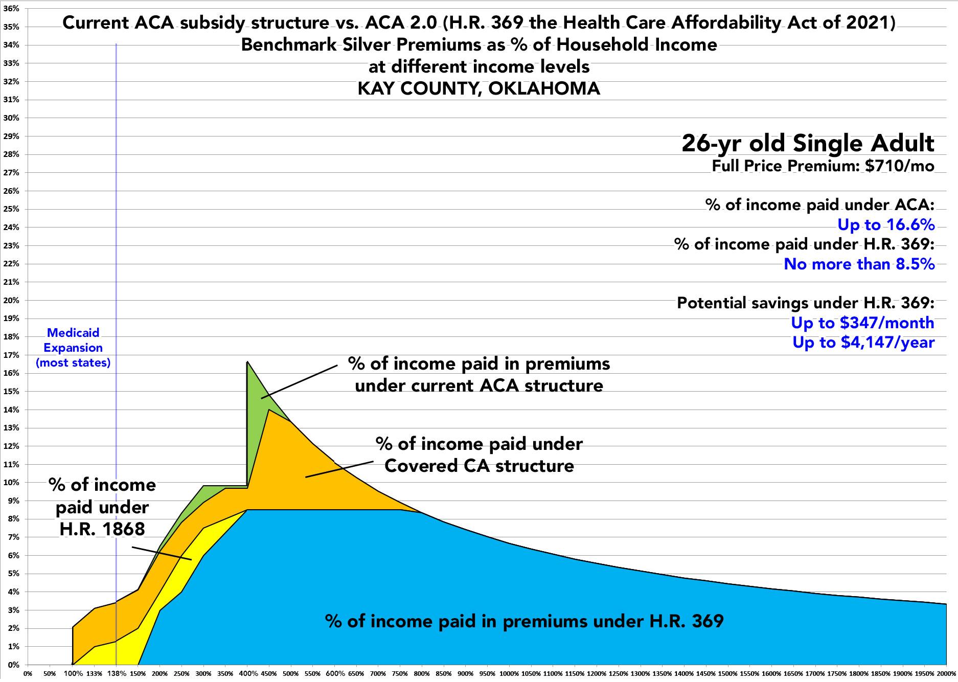 A single 26-year old adult in Kay County, Oklahoma would save up to $122/month even if they're already subsidy-eligible (up to $1,466/year), and if they earn just over 400% FPL, they'd save up to $347/month or over $4,100/year.