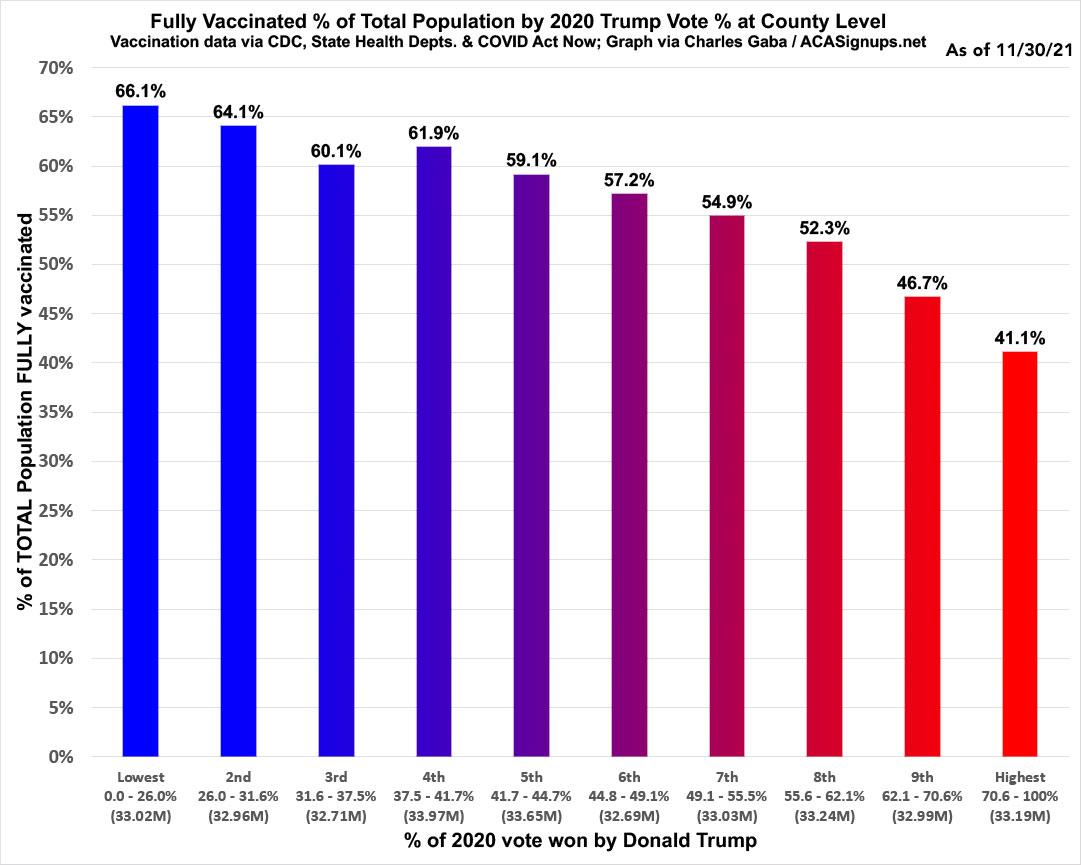 Here's what the data above looks like in bar graph format, broken out in rough deciles (tenths of the total population, or around 33.1 million people apiece). The vaccination rate in the bluest tenth of the nation is still running over 60% higher than the reddest tenth:
