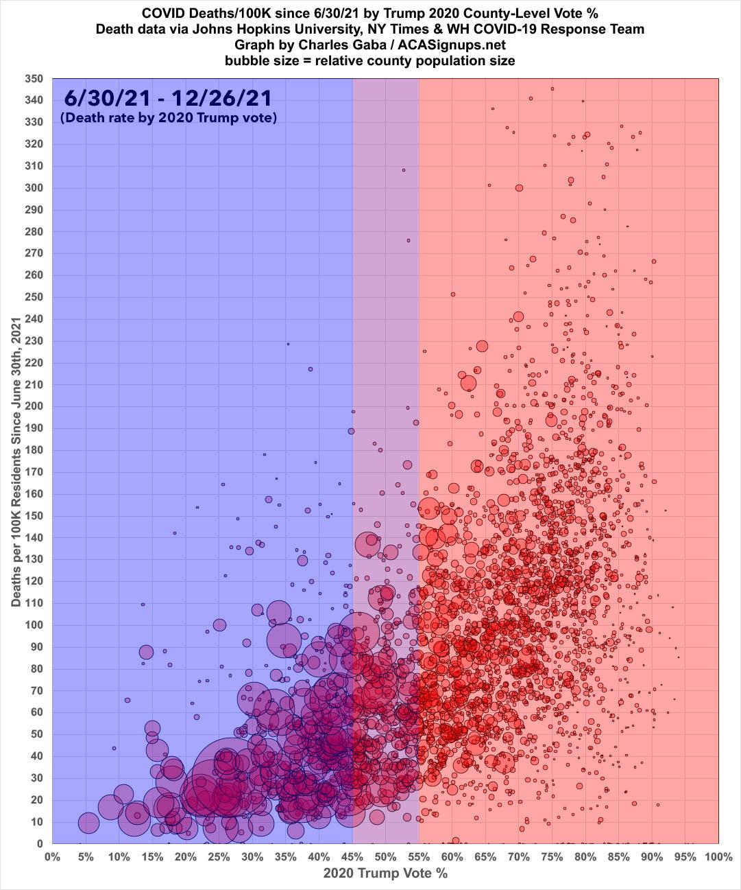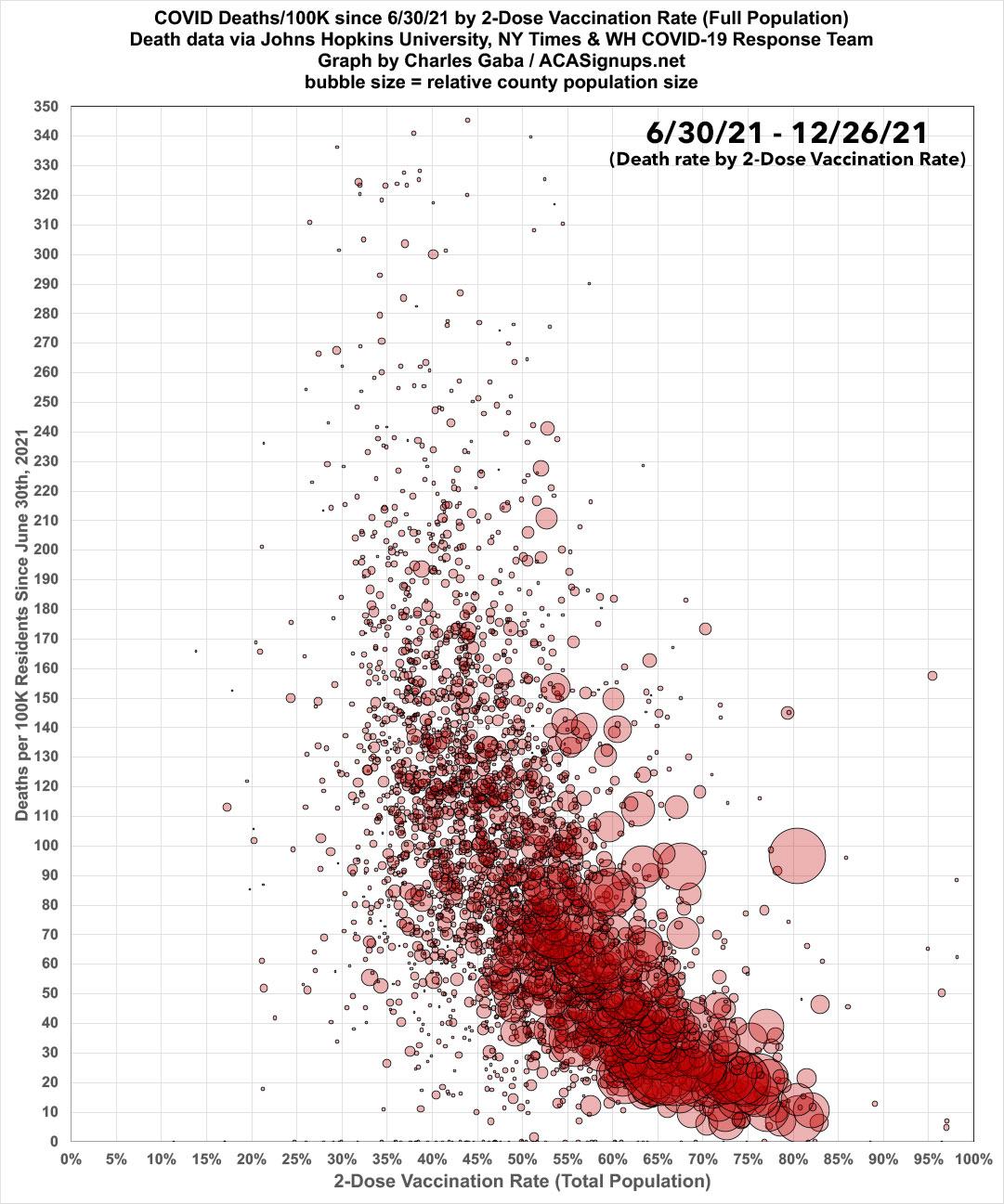 Meanwhile, here's what the same data looks like on a nonpartisan basis: Case and death rates based purely on vaccination rate of each county. The following graphs are up to date as of 12/23/21 (there was little reporting over the holiday weekend). Both measure the county-level case and death rates since the end of June compared against what percentage of the population is fully vaccinated (i.e., 2 doses of Pfizer/Moderna or 1 dose of Johnson & Johnson).