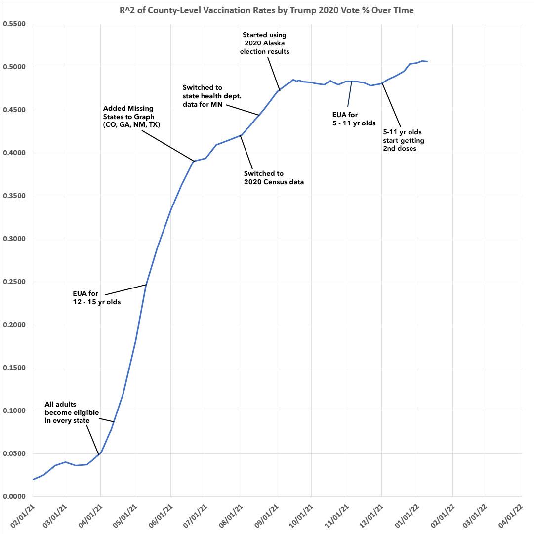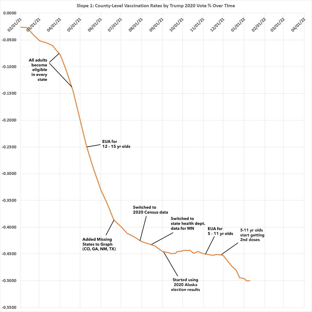 As I predicted back in mid-November, the most obvious reason for this is that 5 - 11 year-olds started receiving their 2nd Pfizer shot around Thanksgiving. The parents who were most likely to have gotten vaccinated themselves earlier this year are pretty clearly the ones most likely to get their children vaccinated, and the parents least likely to get vaccinated are, sadly, also those least likely to vaccinate their children either: