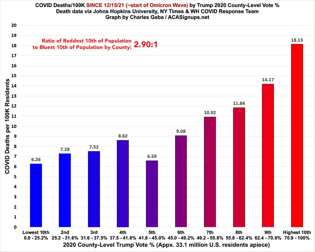 Here's the same data from a NONPARTISAN view: This is based purely on 2-dose vaccination rates (as of 12/15/21). Case rates in the least-vaccinated tenth of the U.S. ran 2.1x higher than in the most-vaccinated tenth, while death rates ran nearly 4.8x higher: