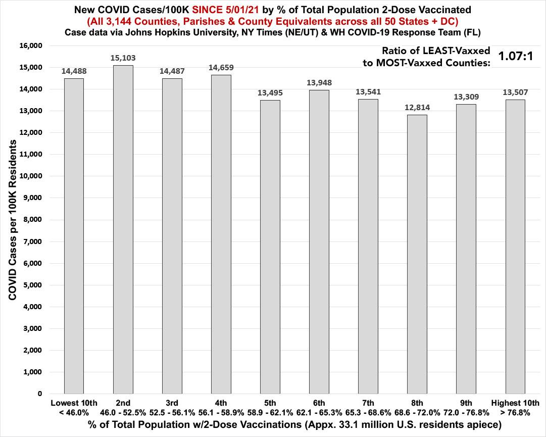 First, let's look at vaccination rates. These bracket sizes change slightly from week to week as more people in every bracket join the "2nd shot vaccinated" population, but for the most part they're pretty stable relative to each other. As you can see, since May 1, 2021, the official cumulative case rate hasn't actually varied much whether a given county has a high or low vaccination rate.