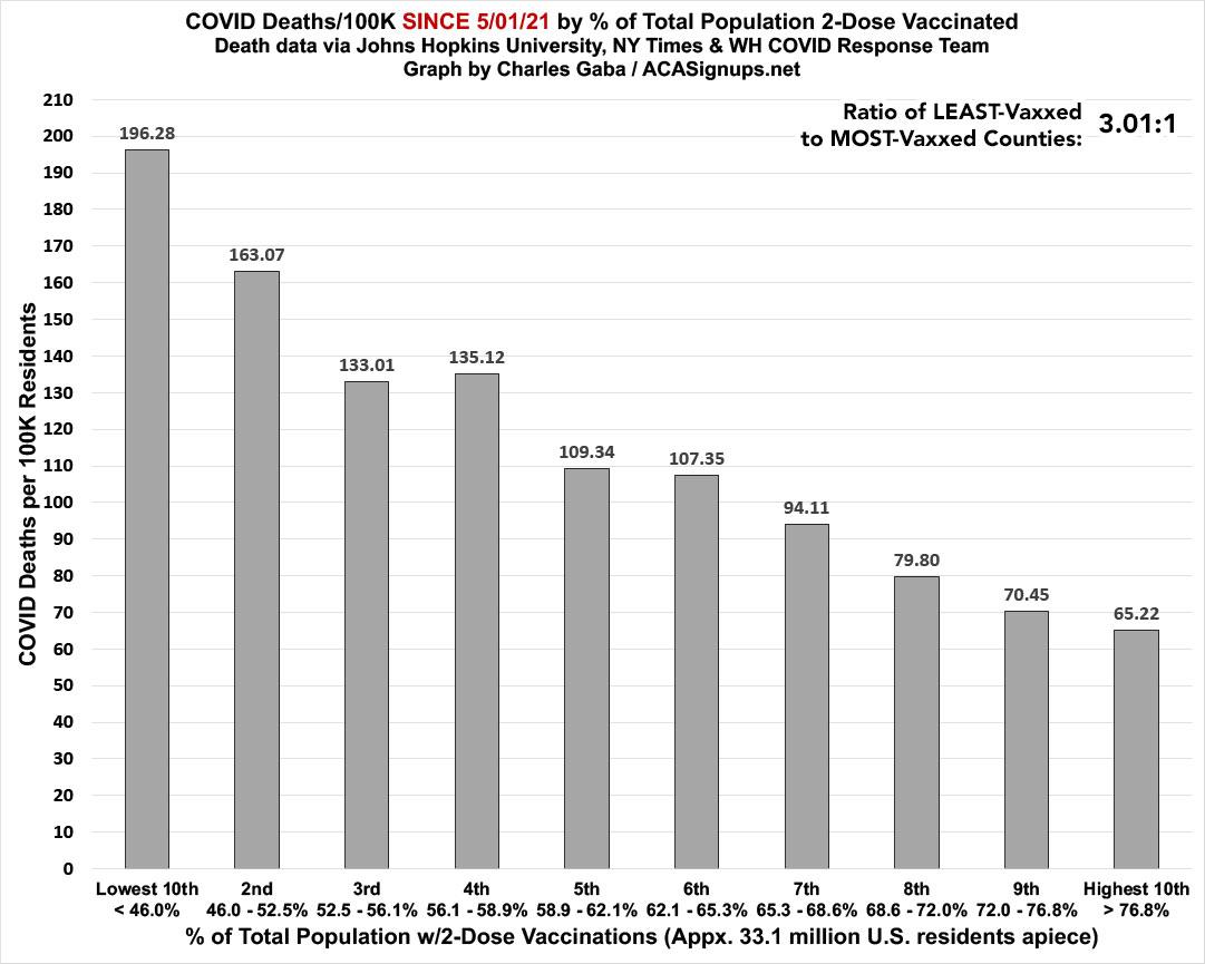 ...HOWEVER, when it comes to death rates, there's still a clear and dramatic correlation between how much of the population has been 2-dose vaccinated and its COVID death rate since last May. The least-vaccinated decile has a death rate over three times higher than the most-vaccinated decile: