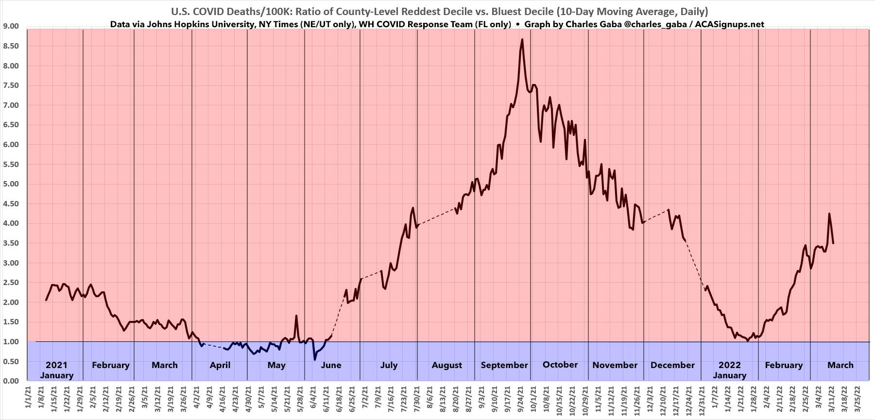 I've also added a new graph. This one shows the 10-day moving average of the ratio between the DAILY death rates in the reddest & bluest deciles, dating all the way back to January 1, 2021. As I predicted back in late December, after reaching near parity in late January, the death rate in the reddest parts of the country is again on the rise relative to the bluest parts: