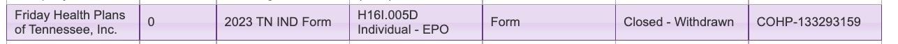 • Friday Health Plans appears to be dropping out of Tennessee's individual market--or, at least, they've withdrawn their 2023 filing and haven't resubmitted a new one as of yet.