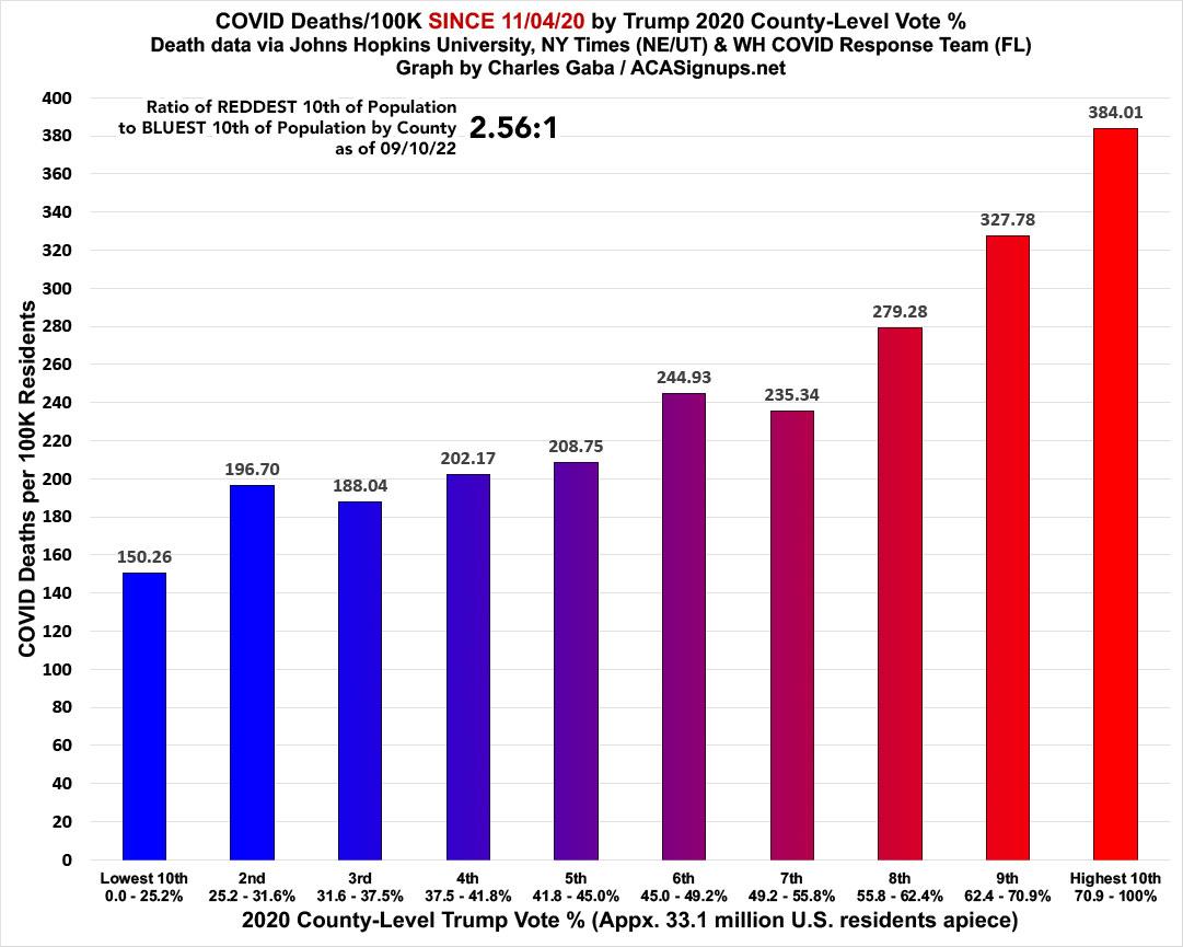 In fact, as of September 10th, 2022, COVID deaths since the 2020 Election were 2.56x higher in the reddest tenth of the country than the bluest tenth.