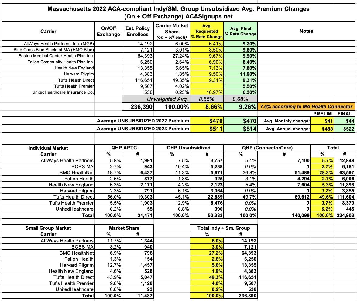 Massachusetts: Final avg. unsubsidized 2023 #ACA rate changes: Either +9.3% or +7.6%