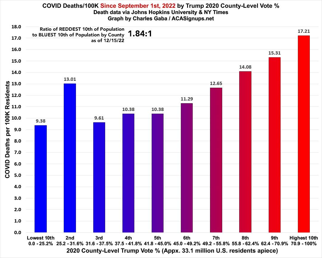 As always, what's even more disturbing is how closely the death rate by partisan lean matches the death rate by vaccination rate; they're almost mirror images of each other: Again, while the ratio has dropped since September, the death rate since May 1, 2021 in the reddest tenth of the country is, again, 2.8x higher than in the bluest tenth:
