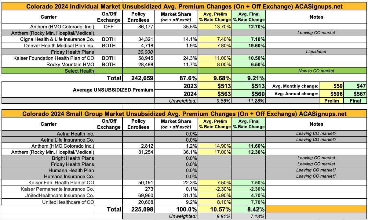 Colorado: *Final* avg. unsubsidized 2024 #ACA rate changes: +9.2%
