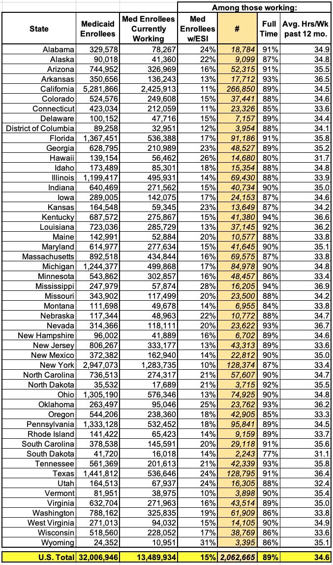 The study even includes a state-by-state breakout of how many Medicaid enrollees were employed as of a year ago and what percentage of them were estimated to also have employer-sponsored coverage at the time: