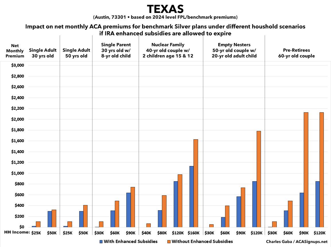 That's the macro level, however. As I did a couple of years ago when the subsidies were originally at risk of expiring in 2023, I decided to run the numbers myself to get an idea of just how much enrollees real-world health insurance premiums would go up in the event the ARPA/IRA subsidies are indeed allowed to expire at the end of next year.