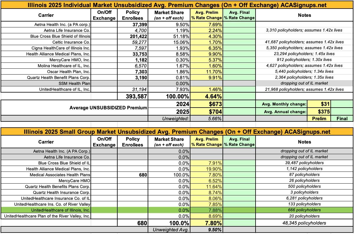 Illinois: Preliminary avg. unsubsidized 2025 #ACA rate changes: +4.6%