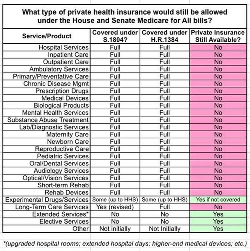 As I explained several times about a year ago, while it's technically true that Bernie's Medicare for All would allow for private "supplemental" health insurance, the list of "supplemental" services which could be insured privately is so tiny as to be laughable. Here's a list of what would supposedly be covered by law under M4All vs. what would still be open to private coverage...and remember, anything covered by M4All couldn't legally be covered by private insurance: