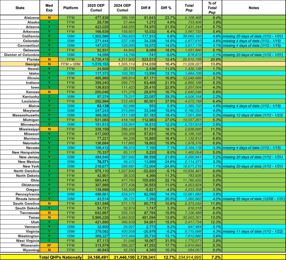 UPDATE 1/24/25: A few more states (CO, CT, ME & NV) have chimed in with their final official OEP tally, bringing the grand total up to 24,183,441 QHPs + 1,754,822 BHPs for a combined total of 25,938,263.