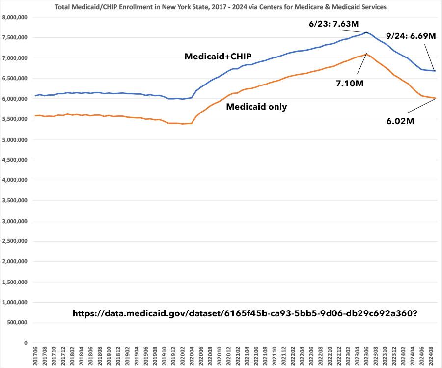 If you look at Medicaid only, total enrollment in NY peaked at 7.1 million in June 2023 and had dropped to just under 6.0 million as of October 2024, the most current month for which federal data is available (CHIP is sometimes included, sometimes not, so I won't quibble about that one).