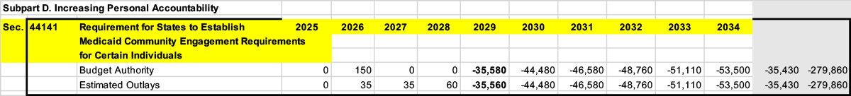 In addition, while I could be wrong about this, but it looks to me as though this latest CBO projection still assumes the Job Loss Penalty (aka "work reporting requirements") wouldn't kick in until 2029 even though yesterday it was reported that the House GOP is bumping them up by 2 years to 12/31/26 (it looks like they're assuming ~$150 million in administrative preparation costs in 2026-2028):