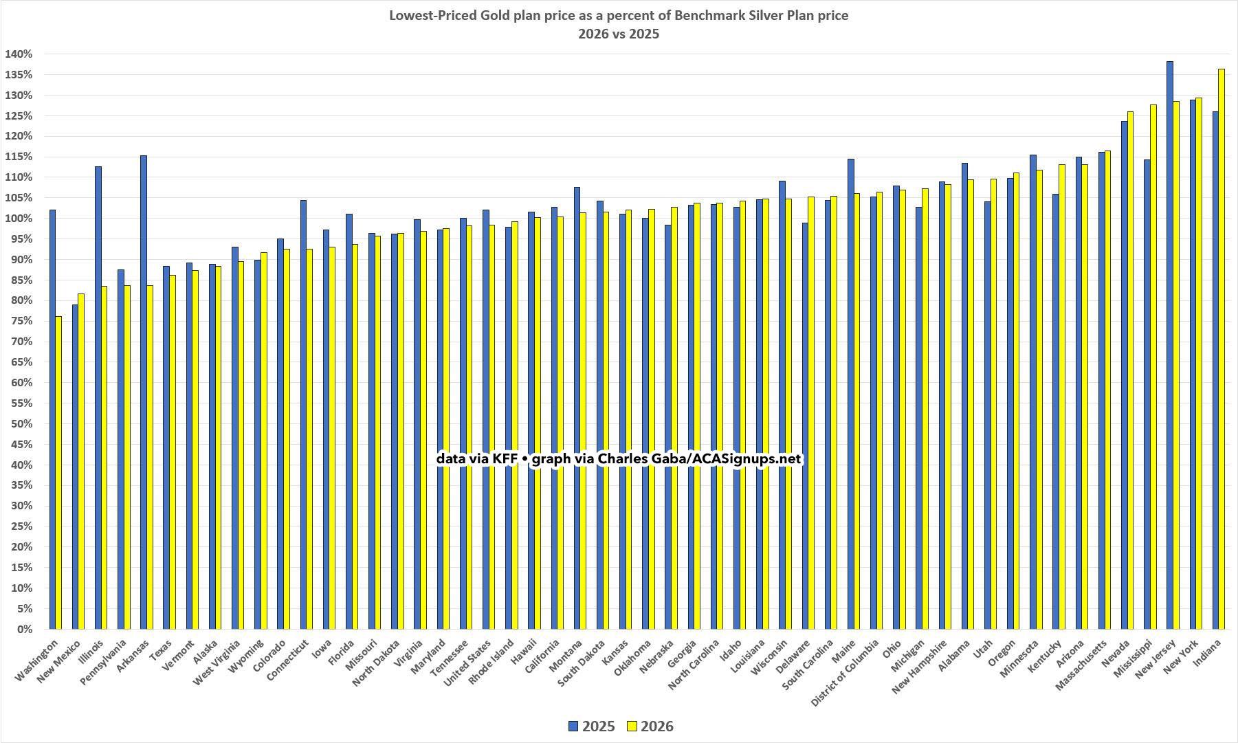 For instance, in my home state of Michigan, the average benchmark Silver plan costs $404/mo this year, while the lowest-cost Gold plan averages slightly higher at $415/mo. For 2026, these are both going up significantly: The benchmark will be $523 while the lowest Gold will be $561. Since Michigan is not, unfortunately, among the states which has implemented PA, this makes sense.