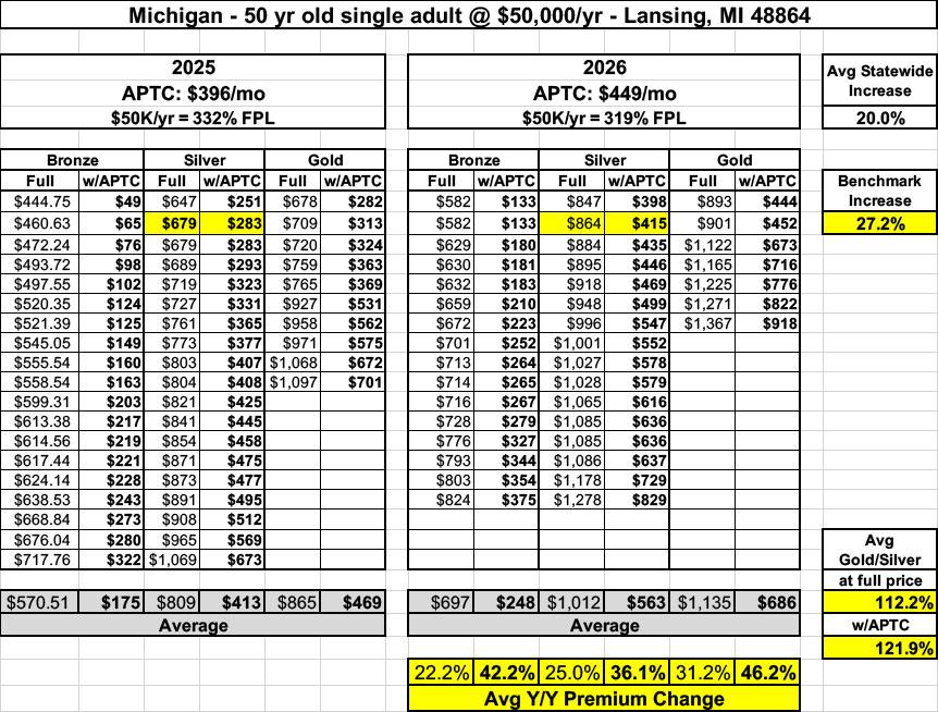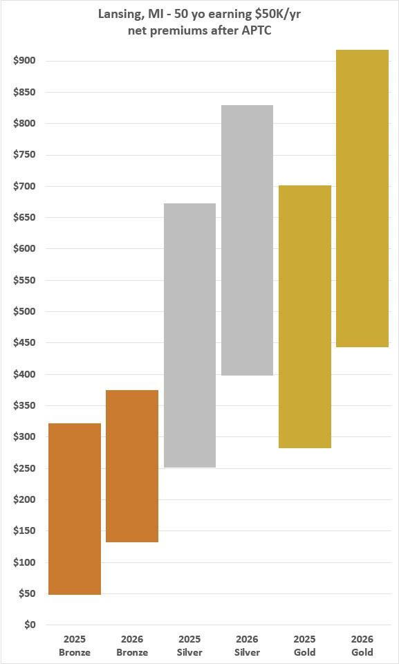 In Lansing, Michigan, a 50-yr old earning $50K/year is eligible for $396/mo in APTC this year, making Bronze plans range from $49 - $322/mo, Silver from $251 - $672 and Gold from $282 - $701.