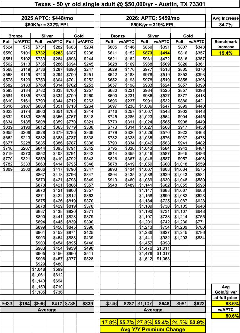 TO BE CLEAR: Premium Alignment is NOT a substitute or replacement for making the enhanced ACA tax credits permanent. It does little to help most folks earning less than 200% FPL or over 400% FPL if they're allowed to expire...and even for those between 200 - 400% FPL (roughly 6 million enrollees at the moment) it's a complement to the upgraded subsidies, not a replacement for them. In states where it was already implemented before 2026, the lost tax credits will still cause net expenses to go up (as you can see in Texas).