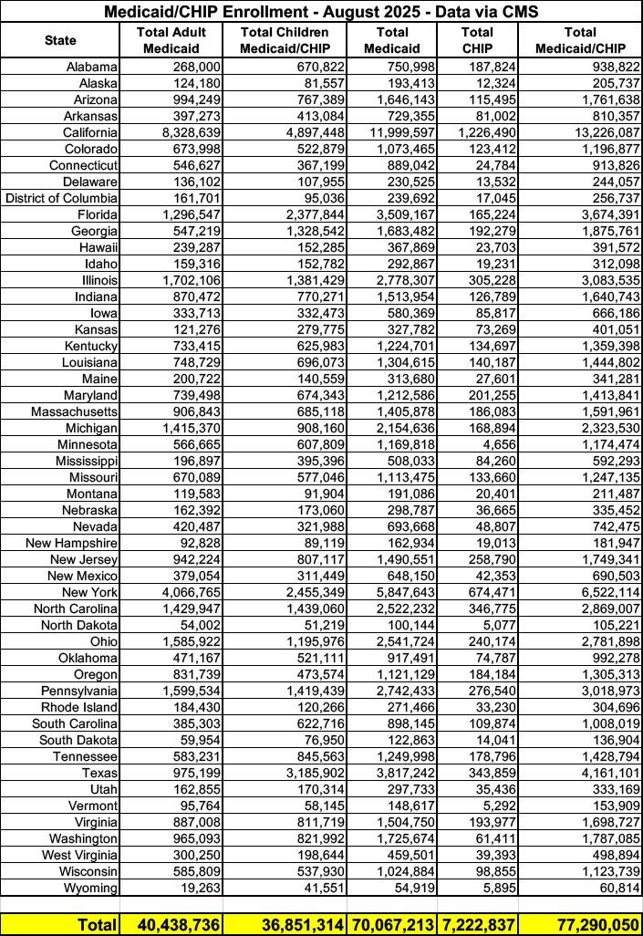 Trump Regime posts claimed August 2025 Medicaid/CHIP enrollment report: 77.3M, down 2.16M since last December