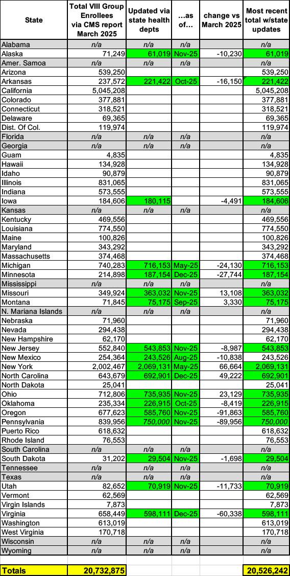 I've been able to cobble together more recent ACA expansion enrollment for about half of the 40 states (+DC) which participate in the program; since March, expansion enrollment has dropped in some states but is actually up in some others. It remains remarkably stable so far, although this is going to change radically with the draconian provisions of the GOP's Big Ugly Bill starting to kick in soon.