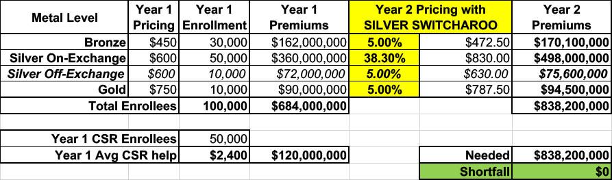 This means that instead of every plan going up by 22.5%, the Silver plans would go up 32.8% while the other metal tiers only goes up 5%: