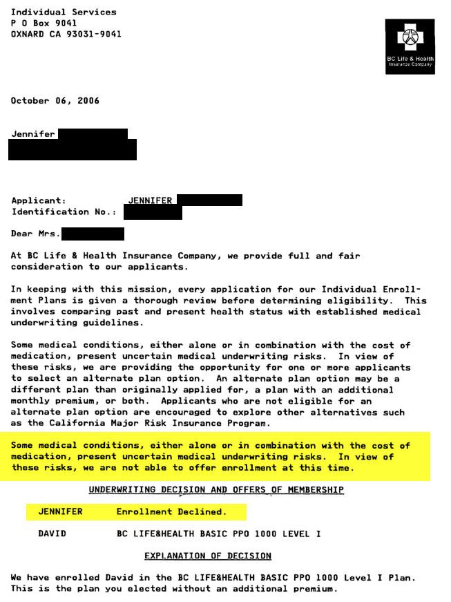 For example, just the other day someone on Bluesky posted a scan of an actual rejection letter she received from a health insurance company in 2006 (four years before the ACA passed and eight years before the ACA regulations were fully ramped up). She gave me permission to use it here: