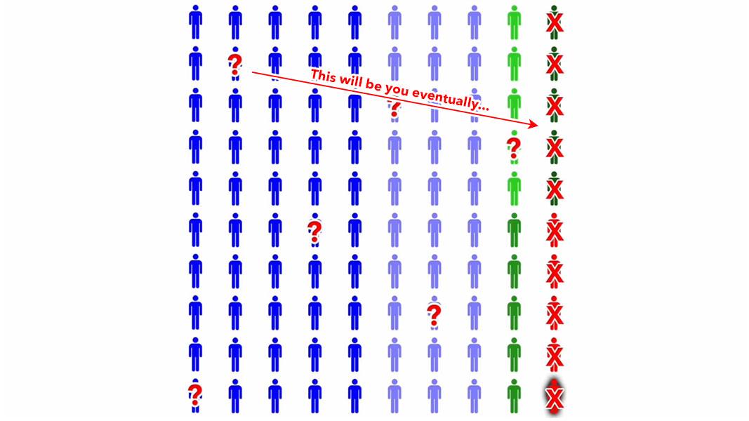 On a long enough timeline, pretty much EVERYONE develops one or more serious medical conditions, putting them into the other 10%.