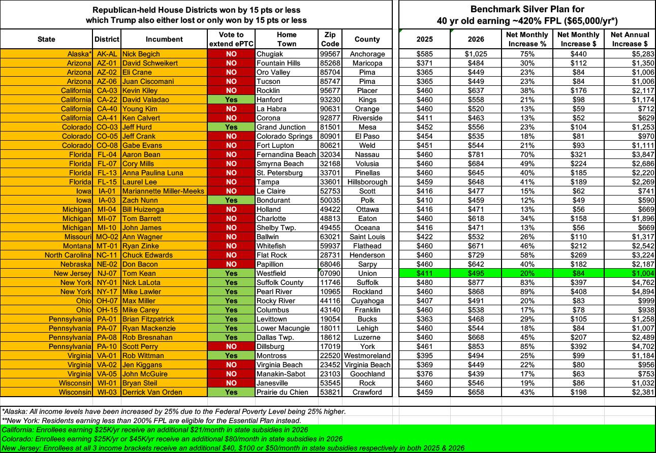 In the end, 17 House Republicans voted with all 213 House Democrats to extend the improved tax credit formula through the end of 2028. Thirteen of the seventeen GOP "Yea" votes represent swing districts (the remaining four were Maria Elvira Salazar in FL-27, Andrew Garbarino of NY-02, David Joyce of OH-14 and Monica DeLa Cruz of TX-15).