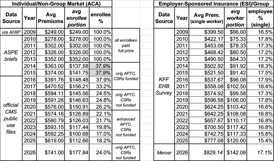 - For group coverage, I'm basing this on KFF data for single worker coverage only, not family coverage, where employers typically pay a lower percentage of premiums. I had to do it this way in order to keep it consistent with the ACA data, which is for individual covered lives.