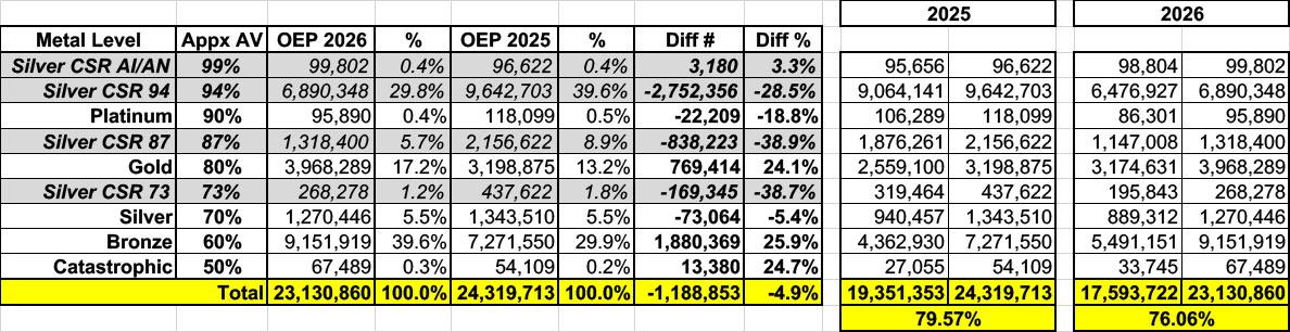 - For 2025 & 2026: CMS's Marketplace Open Enrollment Period Public Use Files, which include the same column but only for the initial Open Enrollment Period data (full-year averages, which will vary from these slightly, won't be available until at least July for 2025 and not until next year for 2026 for obvious reasons).