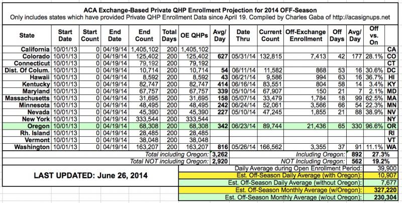 Compared with the previous report, MD had a 4,300 QHP increase from 5/10 - 5/31, and an increase of 4,450 since the end of the open enrollment period. This means that they're averaging around 106 per day, or 31% of their average rate during open enrollment...which has had a significant impact on the Off-Season Projection Chart that I started posting yesterday (as you can see, MD had been only running 2% of the OE rate until now).