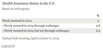 PRINCETON, NJ -- Five percent of Americans report being newly insured in 2014. More than half of that group, or 2.8% of the total U.S. population, say they got their new insurance through the health exchanges that were open through mid-April.