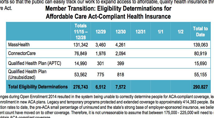 First, we have today's daily MA Health Connector Dashboard report, which states that there have been 148,453 QHP determinations thorugh yesterday (12/29). Assuming 50% of these have selected plans, that's around 74,200 QHP selections to date. In addition, the 134,803 Medicaid (MassHealth) enrollments are already locked in.