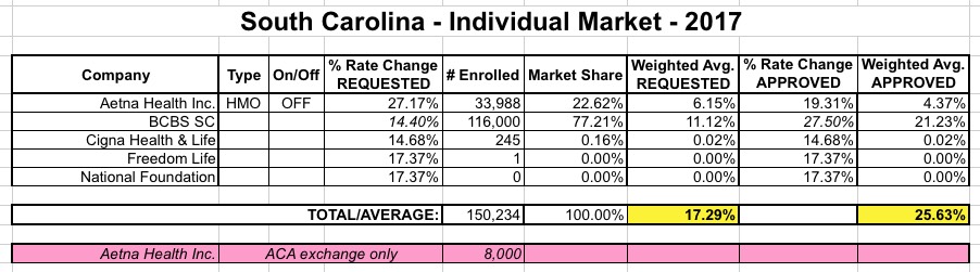 SOUTH CAROLINA: This is one of the 5 states which I still didn't have approved rate changes for. Today the RateReview.HC.gov site finally added in the final numbers for SC, so here's what it looks like: