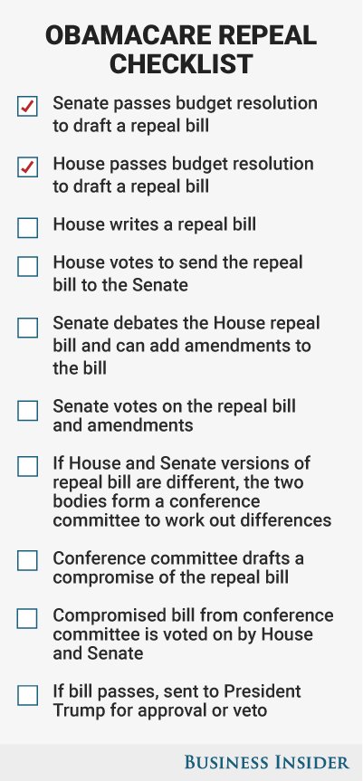 Over at Business Insider, Bob Bryan has posted a writeup explaining where exactly things stand regarding the Republican Party's ongoing ACA repeal process. He's even included the handy checklist to the right.