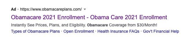 It's far more likely that the most prominent sites to come up in Google's paid search listings will be third-party health insurance brokers. If you click on the link, you may be taken to a legitimate health insurance broker authorized to sell on-exchange ACA policies...or you may be taken to a fly-by-night quasi-legal outfit which either pushes junk plans or simply resells your contact info to fourth-party scammers. In many cases, they may even include the terms "Obamacare" or "ACA" baked into their names: