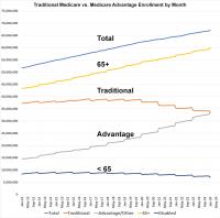 Every month for years now, the Centers for Medicare & Medicare Services (CMS) has published a monthly press release with a breakout of total Medicare, Medicaid & CHIP enrollment; the most recent one was posted in late February, and ran through November 2022.